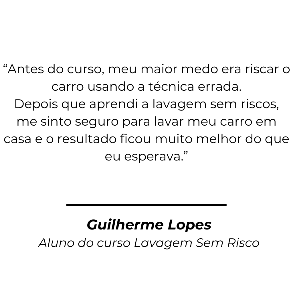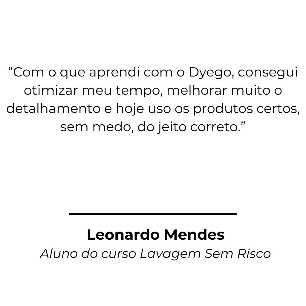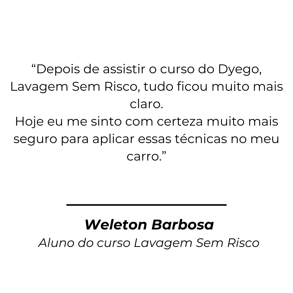 “Depois de assistir o curso do Dyego, Lavagem Sem Risco, tudo ficou muito mais claro. Isso trouxe muito mais clareza pra mim, tirando aquele medo que eu tinha de estar errando. Hoje eu me sinto com certeza muito mais seguro para aplicar essas técnicas no meu carro.”